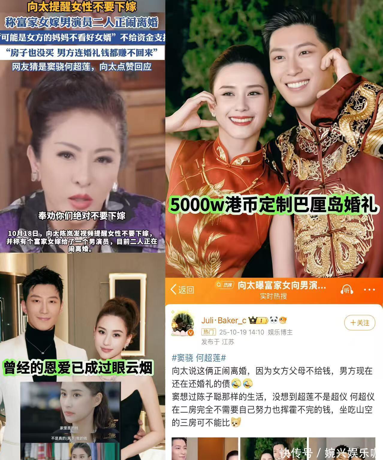 向太在最新视频里劝女生不要下嫁,还拿娱乐圈一对举例子:“我知道一个富家女下嫁给了一个演员,富家女妈妈防着这个男演员,房子都没给买一个,婚礼也是男方出的,他现在出来拍戏连婚礼钱都赚不回来,所以他们现在在闹离婚。”网友通过向太的关键词,发现大部分细节都符合窦骁和何超莲。